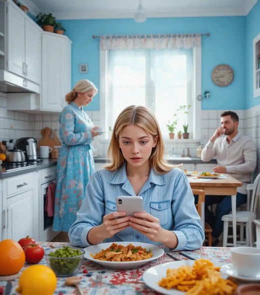 Семейный ужин начался, как обычно: свекровь раздавала советы, Дмитрий шутил, а Андрей молча ел. Ольга наблюдала за ними, её мысли были заняты другими делами, но она всё равно пыталась не потерять нить разговора.