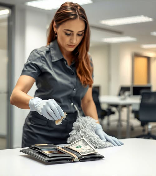 Действительно — взялась за пылесос… Остановилась. Подняла кошелёк. Открыла. Посмотрела внутрь… Ничего не взяла. Затем села за стол, взяла блокнот, что-то написала, положила записку обратно и аккуратно вернула кошелёк на место.